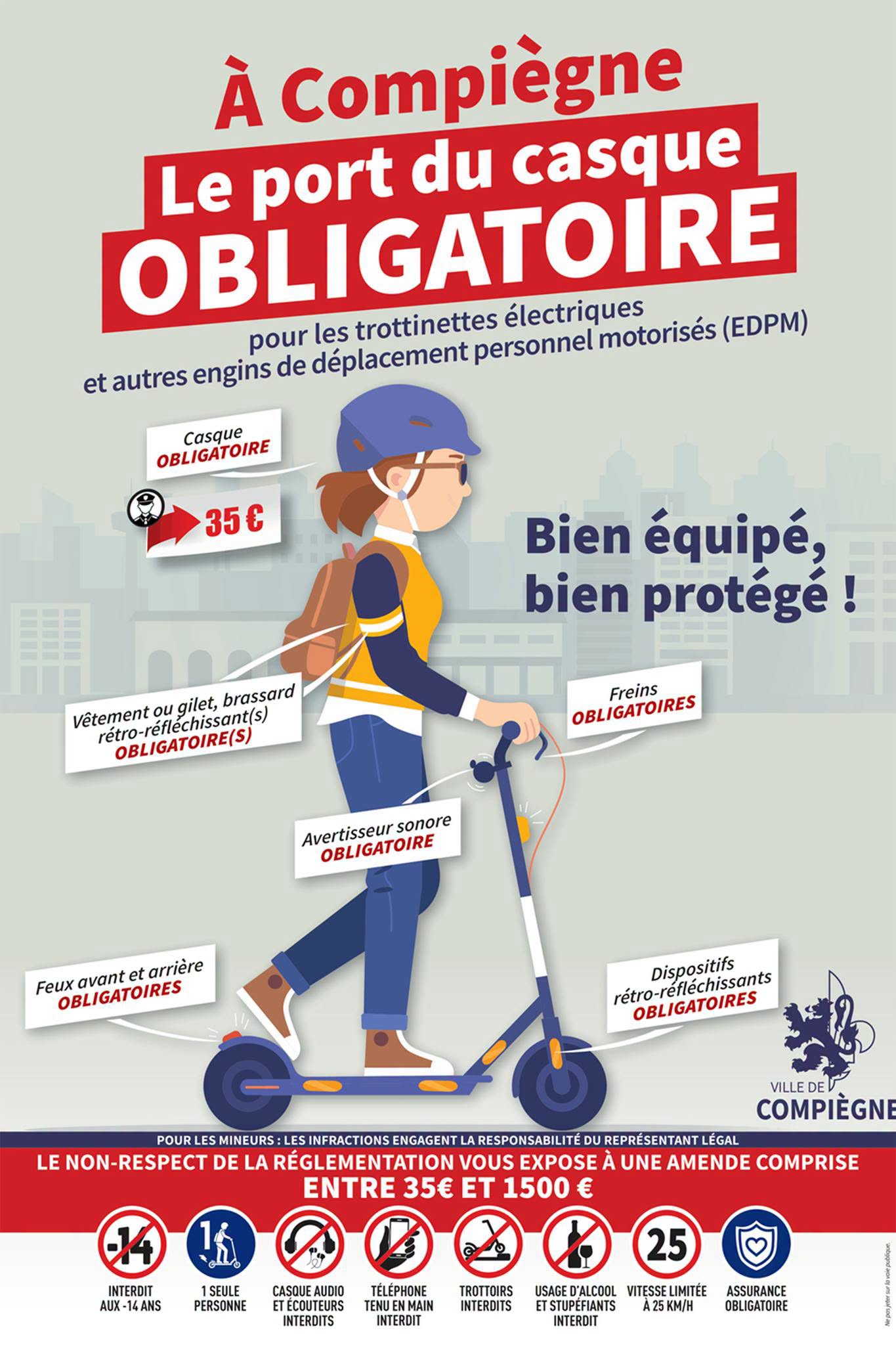 ⛑️🛴À Compiègne le port du casque est obligatoire, pour les déplacements en trottinette. En plus des autres accessoires obligatoires, de l’assurance, et de l’obligation de rouler à 25 km/h max. Le débridage est strictement interdit ! #roulerentrotinette